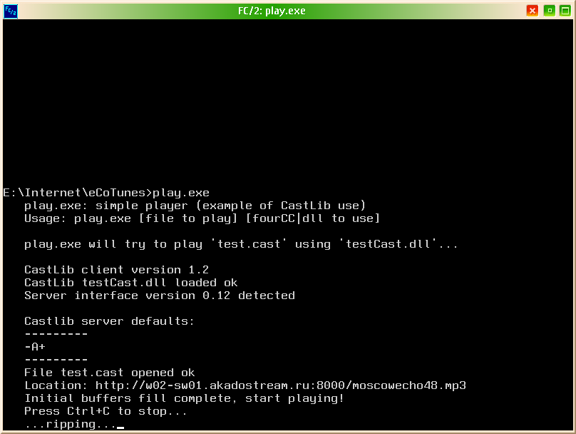 README - you read it now! Changelog - most docs here this time ecotunes.exe - console player cmdpipe/ - command pipe scripts casts/ - some internet audio streams to play (in mmioCast .CAST format) ecotunes.m3u - default audio streams playlist favorite.m3u - default favorite audio streams playlist
